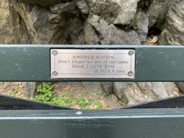 Вот такая табличка висит в Центральном парке Нью-Йорка. На ней некая Наиля признаётся в любви Андрею Костину. Стоит такая табличка от 10 тысяч долларов и плата за неё оформляется как пожертвование Централ парку, а имя донора фигурирует в годовых отчета парка