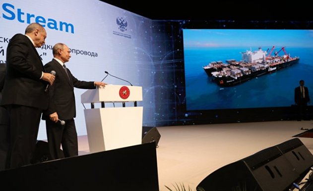 © РИА Новости, Михаил Климентьев | Перейти в фотобанкПрезидент России Владимир Путин и президент Турции Реджеп Тайип Эрдоган на церемонии завершения строительства морского участка газопровода "Турецкий поток"
