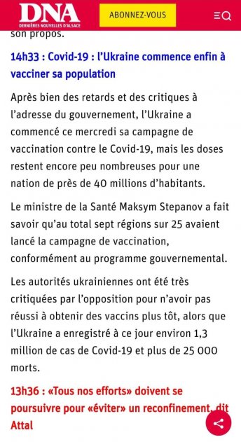 И напоследок. Сегодня о нас писали даже СМИ во Франции. Это статья из эльзаской газеты, которую сегодня читали и хохотали в Страсбурге. Заголовок гласит "Украина наконец-то начала вакцинацию". Наконец-то! И это они ещё не знают чем и как.