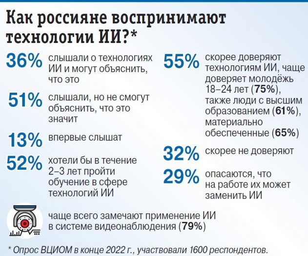 Чтобы эту цель эффективнее реализовать, в обществе должны быть понимание и принятие технологий искусственного интеллекта. По данным опроса ВЦИОМ, всё больше россиян положительно относятся к технологиям искусственного интеллекта. Если в 2021 г. им доверяли 48%, то в 2022-м – уже 55%. Тем не менее у значительной части людей сохраняются насторожённость и предубеждения в отношении искусственного интеллекта. Постараемся их развенчать.