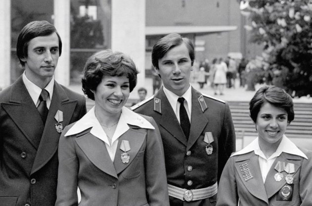 1976 г. Советские фигуристы: Александр Горшков, Людмила Пахомова, Александр Зайцев и Ирина Роднина после вручения им правительственных наград в Кремле.