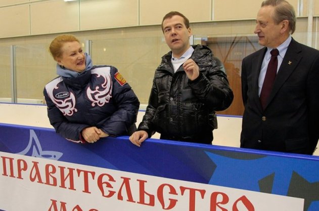 31 марта 2011 года. Президент РФ Дмитрий Медведев разговаривает с заслуженным тренером РФ по фигурному катанию Еленой Чайковской и президентом Федерации фигурного катания на коньках России Александром Горшковым.