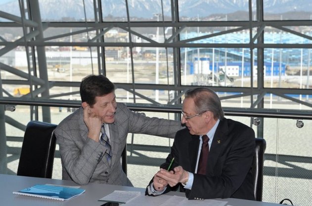 2013 г. первый заместитель председателя Государственной Думы РФ, президент Олимпийского комитета России Александр Жуков и президент Федерации фигурного катания России Александр Горшков во время встречи президента РФ В. Путина с представителями Федерации хоккея и Федерации фигурного катания России в олимпийском ледовом дворце «Большой» в Сочи.
