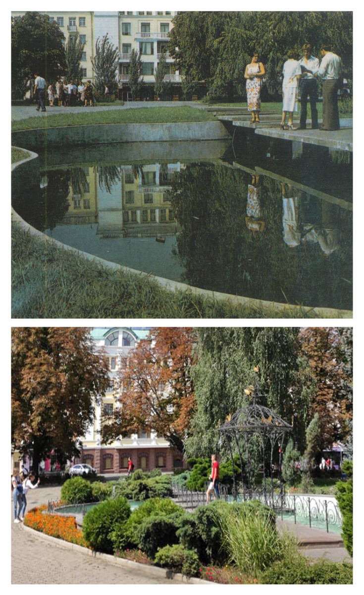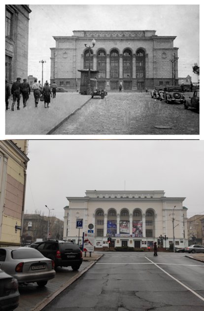 17. Северный сквер Театральной площади в годы оккупации 1941-43 гг. и сегодня. 76 лет назад место сквера выглядело, мягко говоря, неухожено. Остатки частного сектора, хаотичные протоптанные дорожки и дикая неухоженная растительность контрастируют с тем, что мы имеем сейчас.