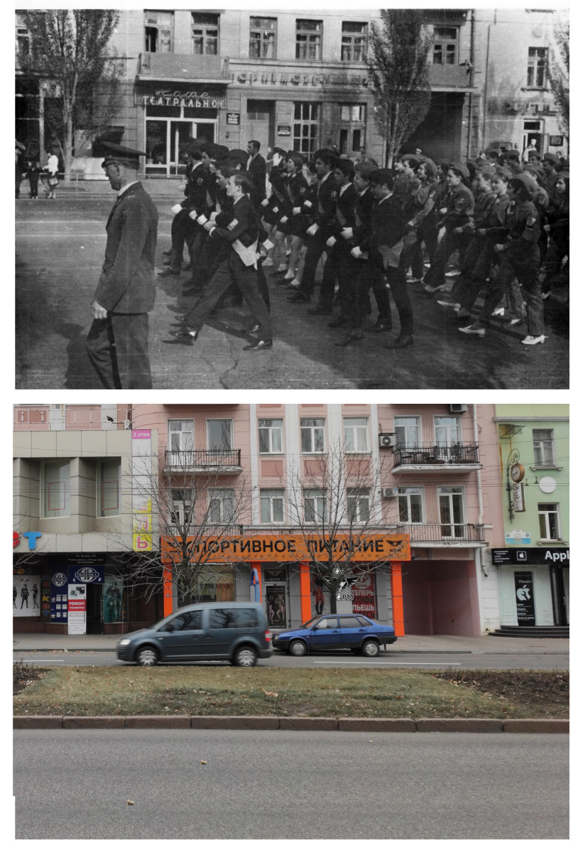 12. Вид с площади Ленина на проспект Ильича. Самые большие изменения в этом ракурсе — исчезнувшие газоны (на их месте выросла плитка) и подросший дом №127 по ул. Постышева. Естественно, что вместо плакатов с лозунгами «Выполним…», «Работаем…» на фасадах теперь реклама.
