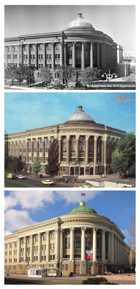 19. Продолжаем двигаться в сторону Северного. Слева по Артема мы видим здание библиотеки им. Крупской. Его начали строить в 1936 г. и продолжали вплоть до лета 1941 года. За годы войны здание было сильно повреждено, книжные фонды уничтожены и разграблены. Но уже в 1943 году, после освобождения города, библиотека возобновила обслуживание читателей. В 1956 г. была завершена реконструкция здания архитектором Н. П. Порхуновым. Скульпторы Н.А. Гинзбург и П. Гевеке украсили здание барельефами советских писателей.