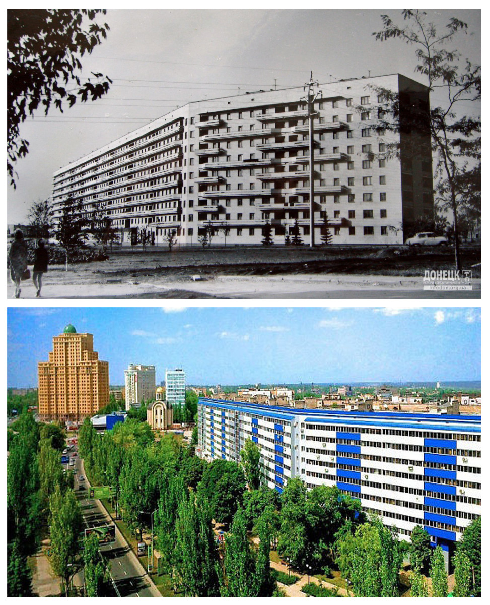18. Собственно сам «виновник торжества» — театр оперы и балета. Строительство здания в городе Сталино началось в 1936 году, и было связано с генеральной реконструкцией города. А через 5 лет, 12 апреля 1941 года, состоялось открытие театра. Ставили оперу М. Глинки «Иван Сусанин». На фото мы можем видеть театр в первые годы после открытия (1941-43 гг.) и сегодня.