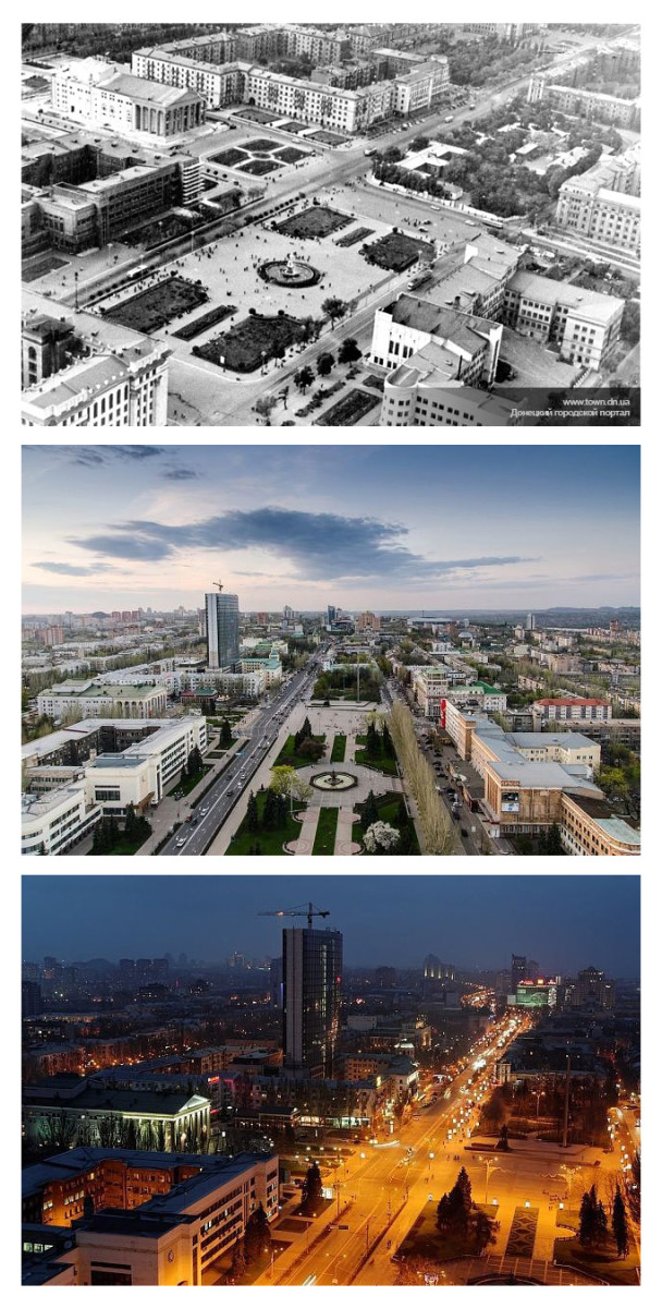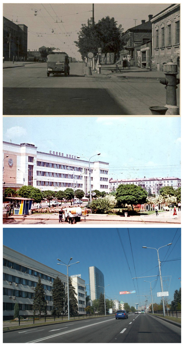 4. Дом советов, «обком» и, наконец, сегодня Ворошиловский райисполком такие имена носило и носит здание, ставшее началом построения композиции центральной площади города Донецка. Именно это здание мы увидим обернувшись назад. Сравним как это место выглядело в 1942-43 гг., в 1960-х и как выглядит сегодня.