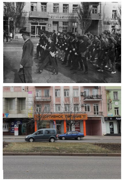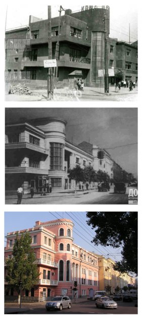 11. Улица Артема около здания гостиницы Донбасс в 1942-43 годах и сегодня. Здание, построенное в 1938 году просуществовало до 26 февраля 2001 года. В рамках «реконструкции» гостиницы старое здание гостиницы было взорвано, а на его месте возведено новое.