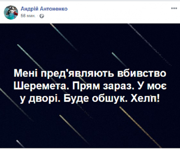 «Мне предъявляют убийство Шеремета. Прямо сейчас. В моем дворе. Будет обыск. Хелп!» — написал Антоненко в соцсети.