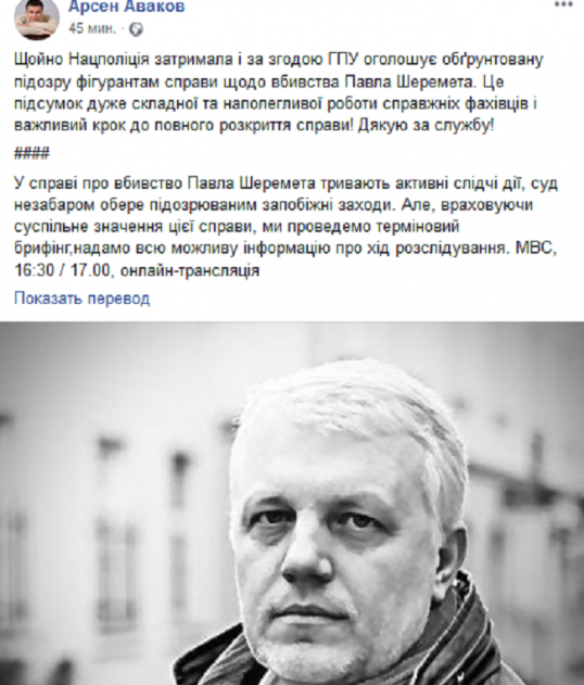 Стоит отметить, что незадолго до этого глава МВД Арсен Аваков написал, что Нацполиция задержала и с согласия ГПУ объявляет обоснованные подозрения фигурантам дела об убийстве Павла Шеремета.