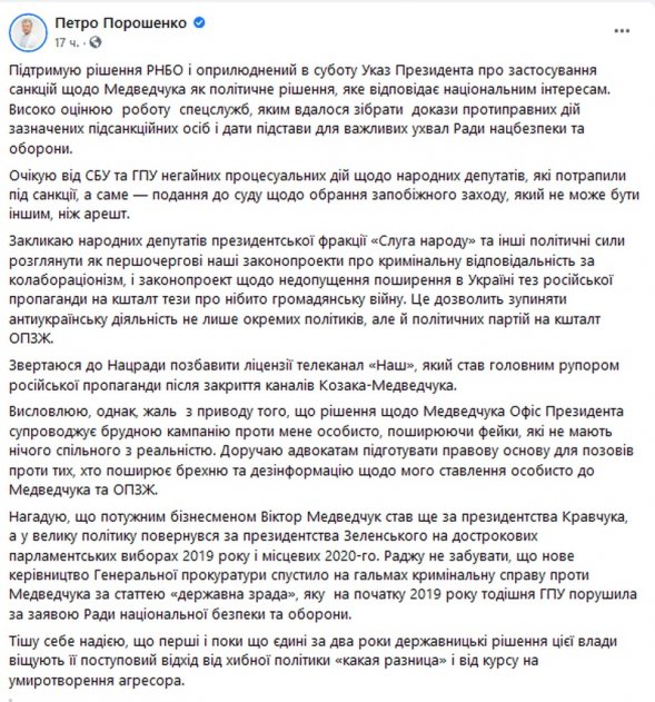 Экс-президент Украины и лидер «Европейской солидарности» Пётр Порошенко заявив, что поддерживает санкции СНБО против главы политсовета «Оппозицонной платформы — За Жизнь» Виктора Медведчука, как «политическое решение, которое отвечает национальным интересам», призвал арестовать оппозиционера и его соратников, а также лишить лицензии телеканал «НАШ», который «стал главным рупором российской пропаганды» после закрытия NewsOne, ZIK и «112 Украина».