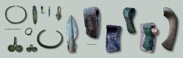 Бронзовый век. Бронзовые и медные браслеты, ножи, рыболовный крючок, остриё, серьга, очковидные подвески, наконечник копья, топоры, глиняная литейная форма