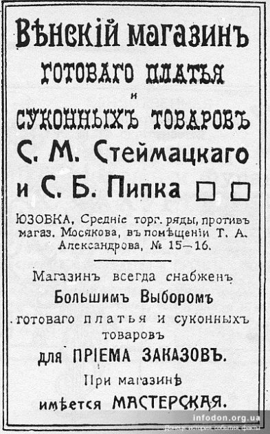 Венский магазин готового платья и суконных товаров С.М. Стеймацкого и С.Б. Пипка. Юзовка, средние торговые ряды, против магазина Мосякова в помещении Т.А. Александрова №15–16