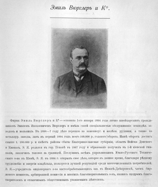 Отдельной группой шли посреднические фирмы — технические конторы, поставлявшие заводам и шахтам машины и материалы, начиная от лопат и заканчивая насосами и электромоторами. Швейцарец Эмиль Яковлевич Вюрглер был одним из братьев Вюрглер – (Карла, Альберта и Эмиля), основавших кондитерскую промышленность Киева. Эмиль Яковлевич, кроме того, стал собственником ведущей в Екатеринославе фирмы по производству инженерно-коммуникационного оборудования, главой акционерной компании по поставке технического и электротехнического оборудования для горнозаводского промышленного юга России, директором-распорядителем Екатеринославского костеперерабатывающего завода, основанного в 1909 году, и представителем товарищества фабрики вентиляционных моторов в Екатеринославе.