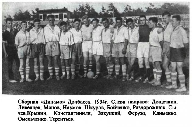 Сборная Динамо Донбасса. 1934 год. Слева направо: Дощечкин, Ливенцев, Манов, Наумов, Шкуров, Бойченко, Раздорожнюк, Сычев, Крынин, Константиниди, Закуцкий, Ферузо, Клименко, Омельченко, Терентьев