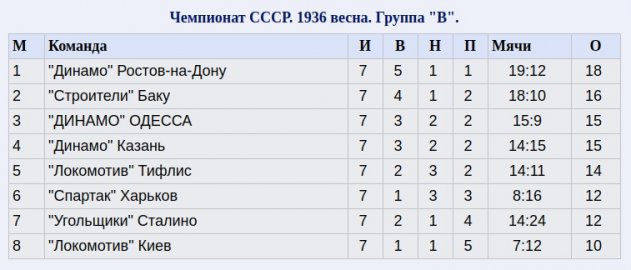 Итоговая турнирная таблица первого чемпионата СССР в группе В