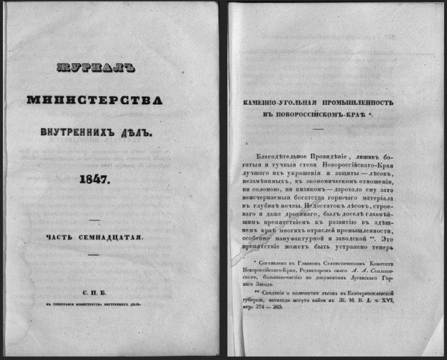Наиболее ранняя из работ посвященных истории открытия каменного угля и развития каменноугольной промышленности в Донецком бассейне. Составлено в Главном Статистическом Комитете Новороссийского края, редактором Аполлоном Александровичем Скальковским, большей частью по документам Луганского Горного Завода. Скальковский А.А. Каменноугольная промышленность в Новороссийском крае // Журнал министерства внутренних дел. – 1847. – Ч.17. – С.337-378.