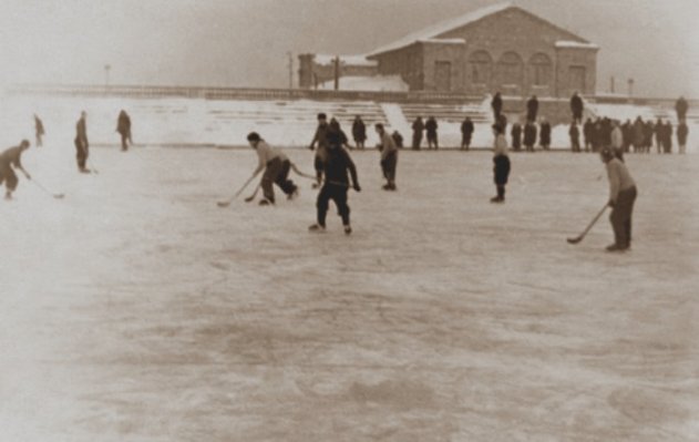 «По льду городского пруда, кое-как очистив от снега небольшую площадку, с шумом носятся дети. В руках у них – суковатые палки, на ногах – коньки. Идёт игра в «хоккей». Так, не ожидая, пока «большие дяди» из горкома физкультуры позаботятся о них, школьники проводят свой досуг. Здесь нет судьи, зато зрителей много. С завистью смотрят они на своих сверстников – обладателей коньков. Был бы детский каток с прокатной базой, разве бы они не стали на коньки?»