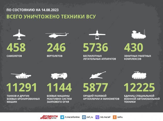 На купянском направлении убито 65 солдат ВСУ, уничтожены три броневика, два пикапа, немецкая самоходная артиллерийская установка Panzerhaubitze-2000 (PzH 2000), две польские САУ Krab, а также САУ «Гвоздика», гаубицы «Мста-Б» и Д-30. На донецком направлении украинские войска потеряли 150 бойцов, два танка, три броневика, пять машин, британские гаубицы FH-70 и «Мста-Б».