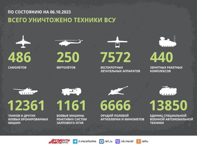 Всего с начала СВО сбито 486 самолетов, 250 вертолетов и 7572 беспилотника врага. Уничтожены 440 ЗРК, 12361 танк и другие бронированные машины, 1161 машина РСЗО, 6666 артиллерийских орудий и минометов, а также 13850 единиц спецтехники противника.